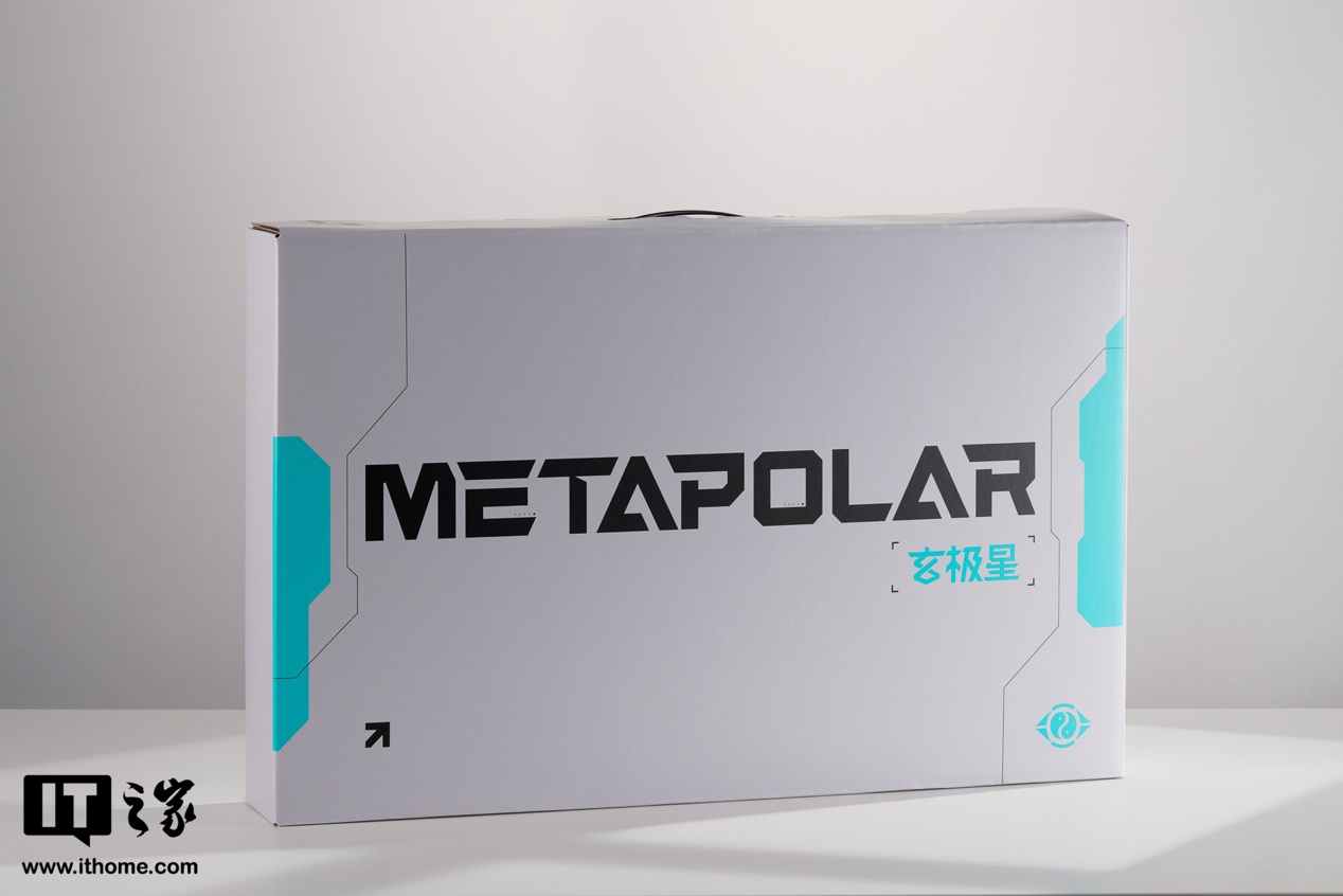 玄派玄极星 16 的包装采用银白 + 薄荷绿配色,并通过左右两条机械风装饰,暗示了它的设计风格。正面居中位置印有黑色的 METAPOLAR 字母标志以及薄荷色的玄极星系列名称。