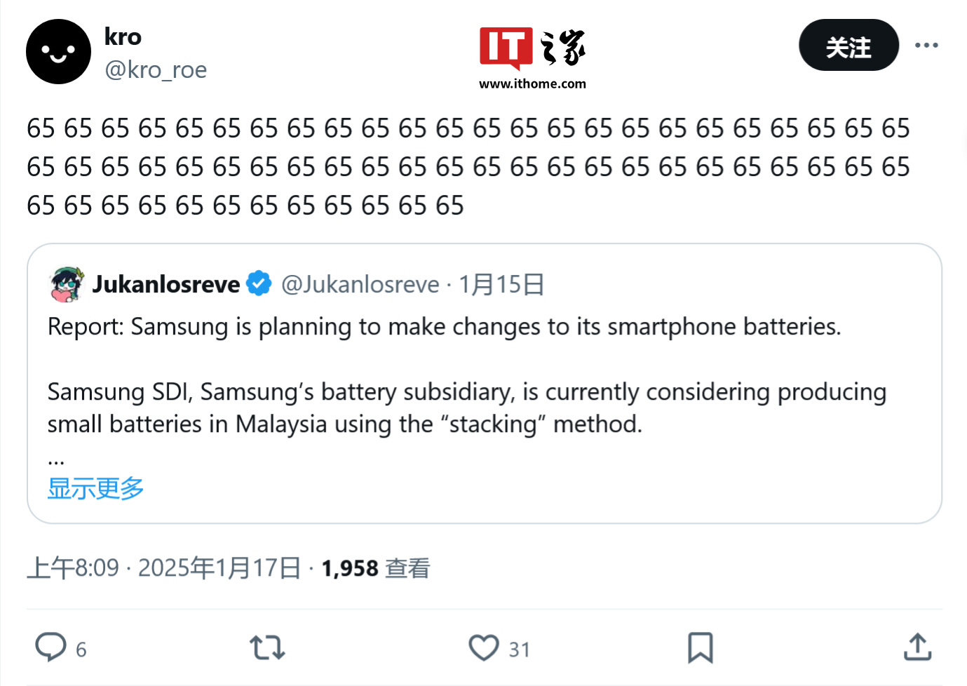 IT之家 1 月 18 日消息,科技媒体 sammyguru 昨日(1 月 17 日)发布博文,报道称三星终于决定推进 Galaxy 手机快充,内部正研发 65W 有线快充方案,最快在 Galaxy S26 系列手机中部署。