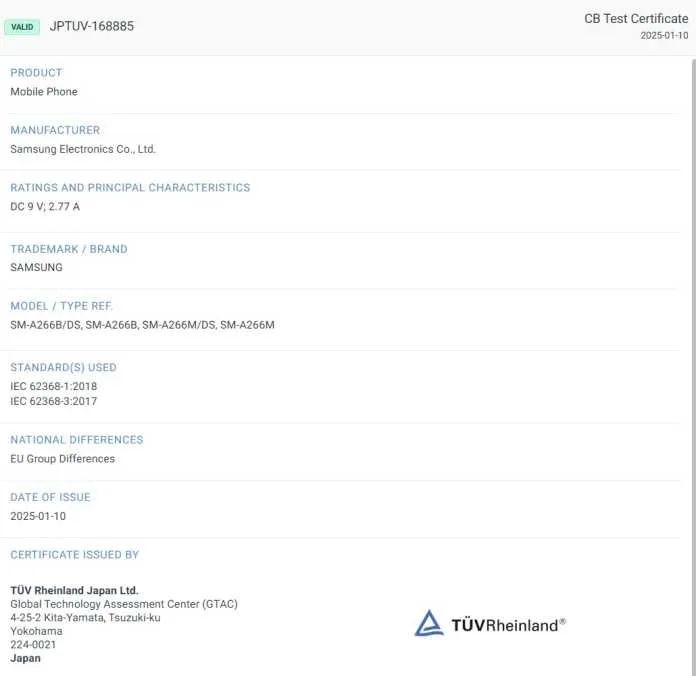 在 TUV Rheinland 认证中,出现了 SM-A266B / DS、SM-A266B、SM-A266M / DS 和 SM-A266M 型号,确认该机支持 25W 有线充电。