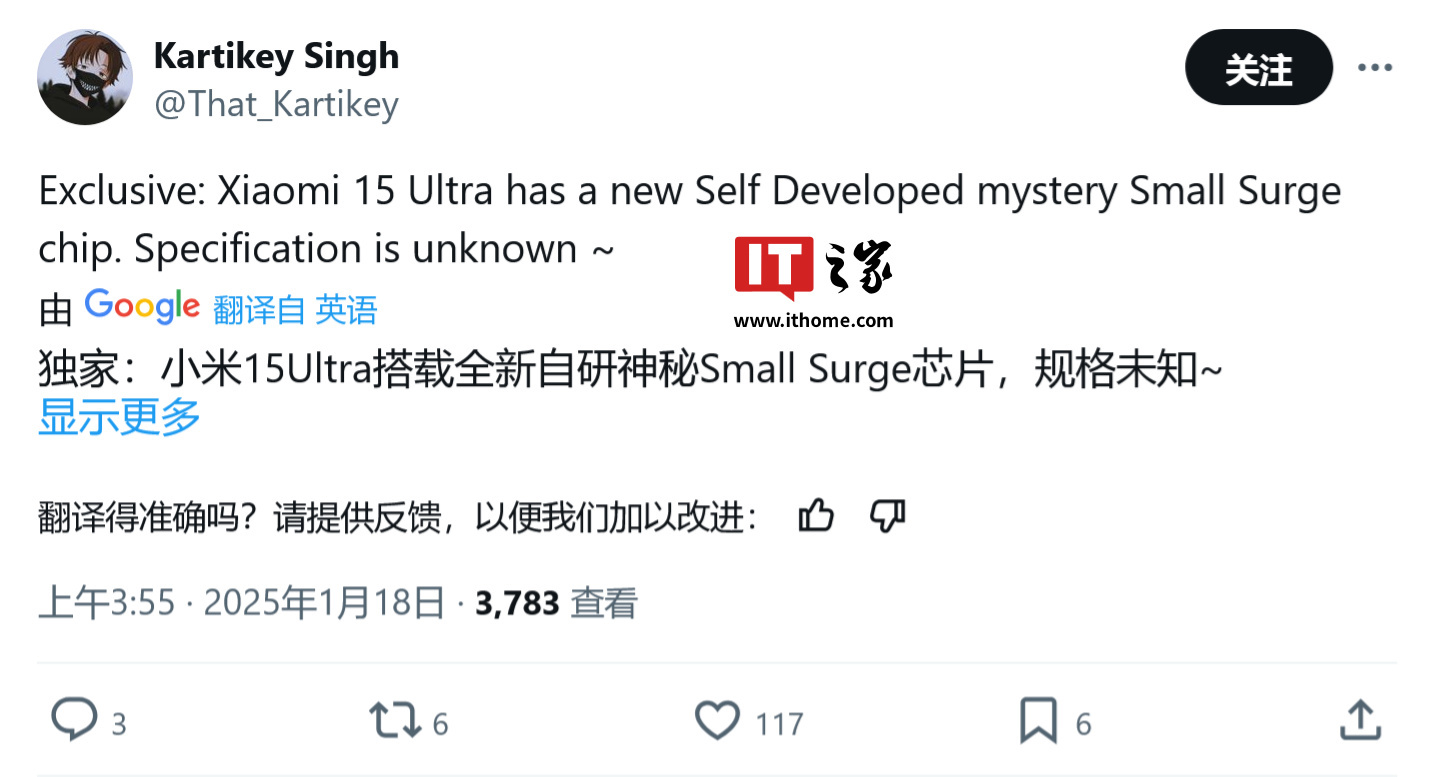 IT之家查询公开资料,消息源 @That_Kartikey 于 1 月 18 日在 X 平台发布推文,曝料称小米 15 Ultra 手机将配备神秘的自研 Small Surge 玄戒芯片,但规格尚不清楚。