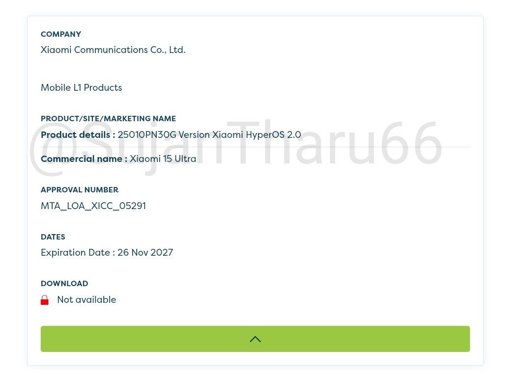 国际版小米 15 Ultra 手机型号为 25010PN30G,已获得 EMVCo 认证,认证号为 MTA_LOA_XICC_05291,有效期至 2027 年 11 月 26 日。
