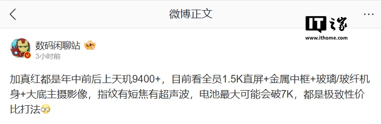 此外,新机的指纹识别方案则包括短焦和超声波两种,值得一提的是,这些新机的电池容量有望突破 7000mAh。该博主称,这些新机“都是极致性价比的打法”。
