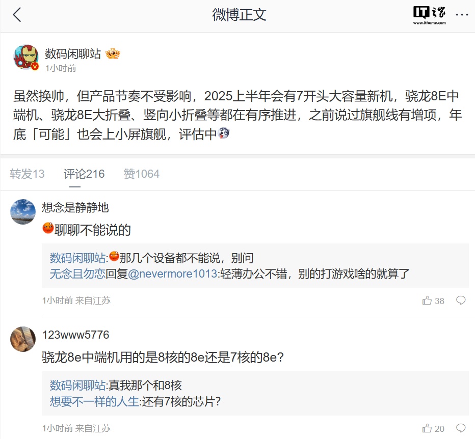 虽然换帅,但产品节奏不受影响,2025 上半年会有 7 开头大容量新机,骁龙 8E 中端机、骁龙 8E 大折叠、竖向小折叠等都在有序推进,之前说过旗舰线有增项,年底「可能」也会上小屏旗舰,评估中