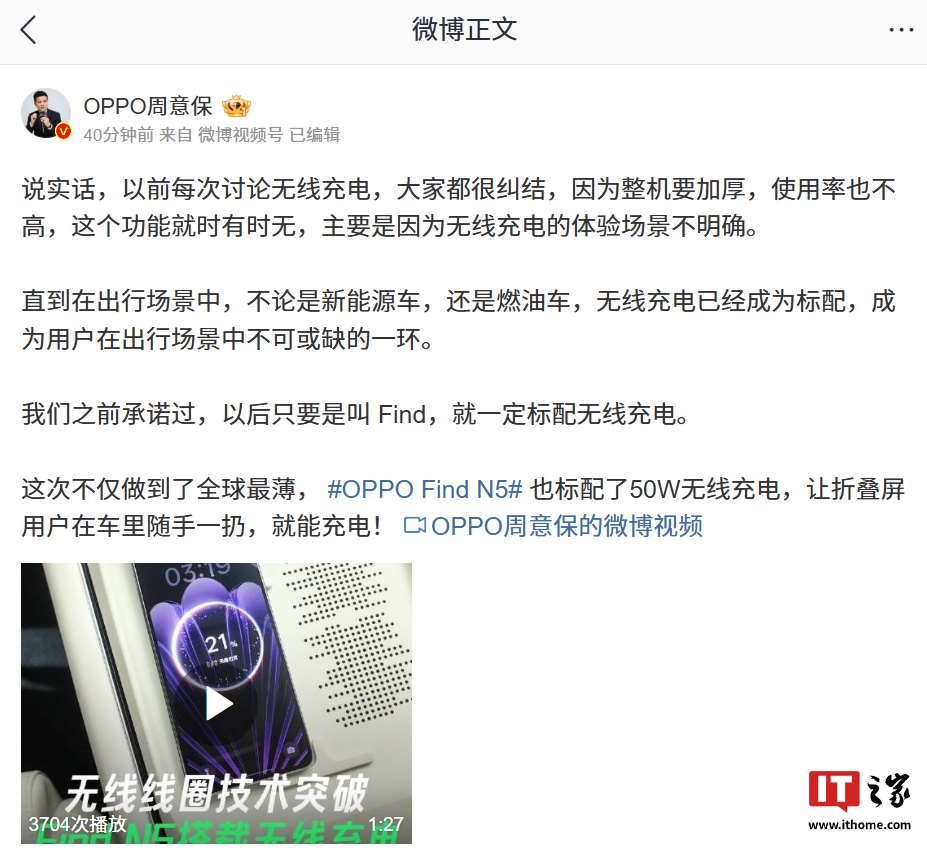 OPPO Find 系列产品负责人周意保今日发文确认,Find N5 折叠屏手机将标配 50W 无线充电。另外,OPPO 官方之前承诺过,以后只要新机是叫 Find,就一定标配无线充电。