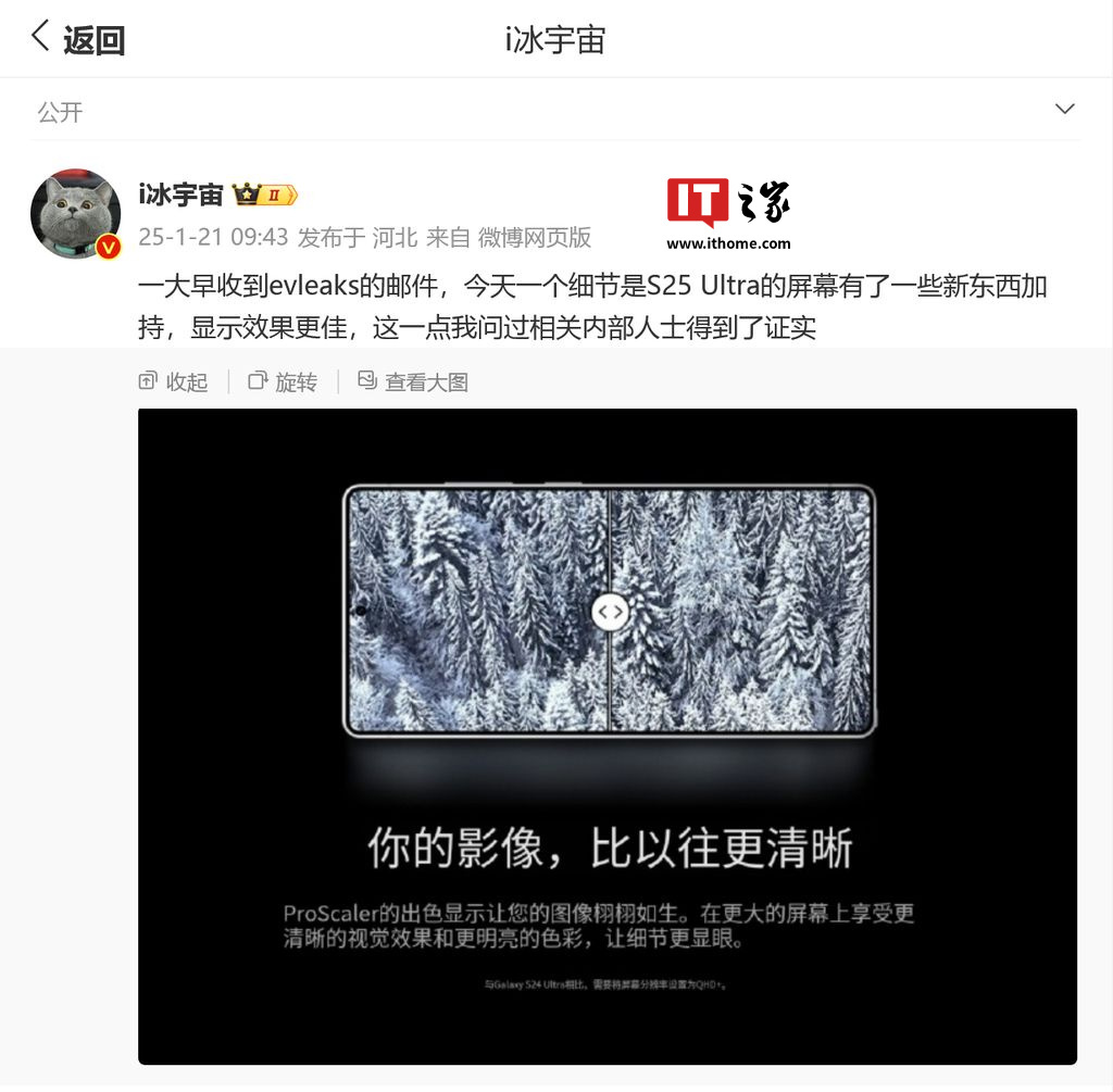 IT之家 1 月 21 日消息,消息源 @i冰宇宙 今天(1 月 21 日)发布微博,表示收到 @evleaks 的邮件,在晒出的一张宣传图片中,展示了三星 Galaxy S25 Ultra 手机屏幕将采用 ProScaler 技术。