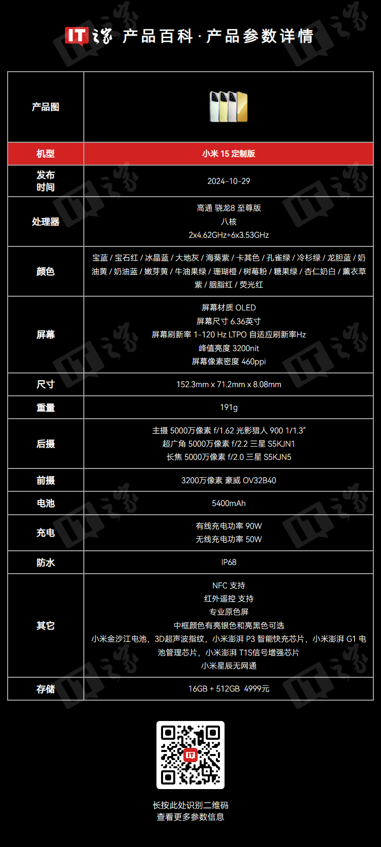 小米 15 定制色版于去年 10 月发布,仅提供 16GB + 512GB 版本,需在小米商城定制,可选 20 种颜色 40 种搭配,定价为 4999 元。