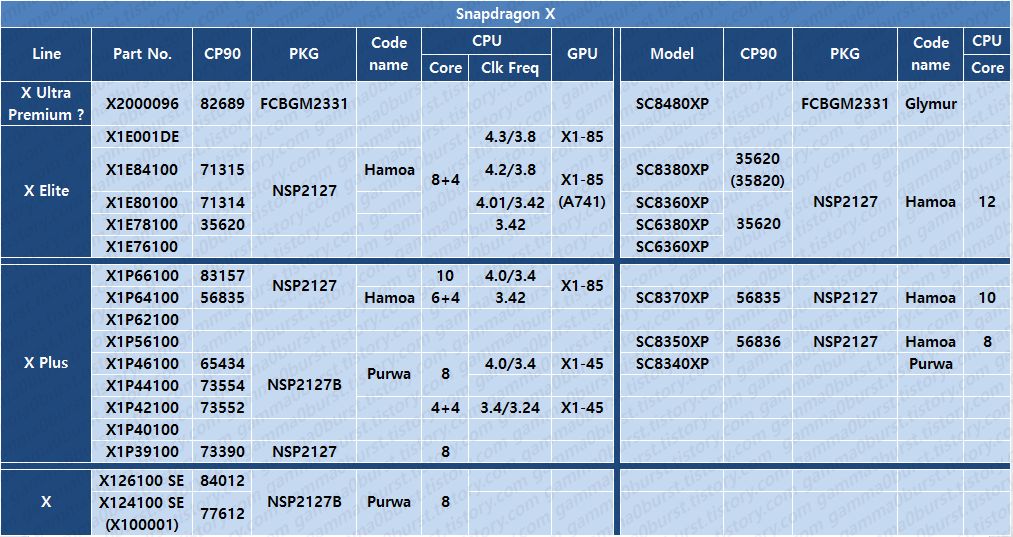 代号 Glymur,此前传闻为第二代骁龙 X 系列的低端型号,与代号 Mahua、Purwa 类似。其封装为 FCBGM2331,由台积电生产,并与 Glymur 使用相同的 PMIC(代号 Superfury)。相比前代 Hamoa 的 NSP2127 封装,规模明显增大。