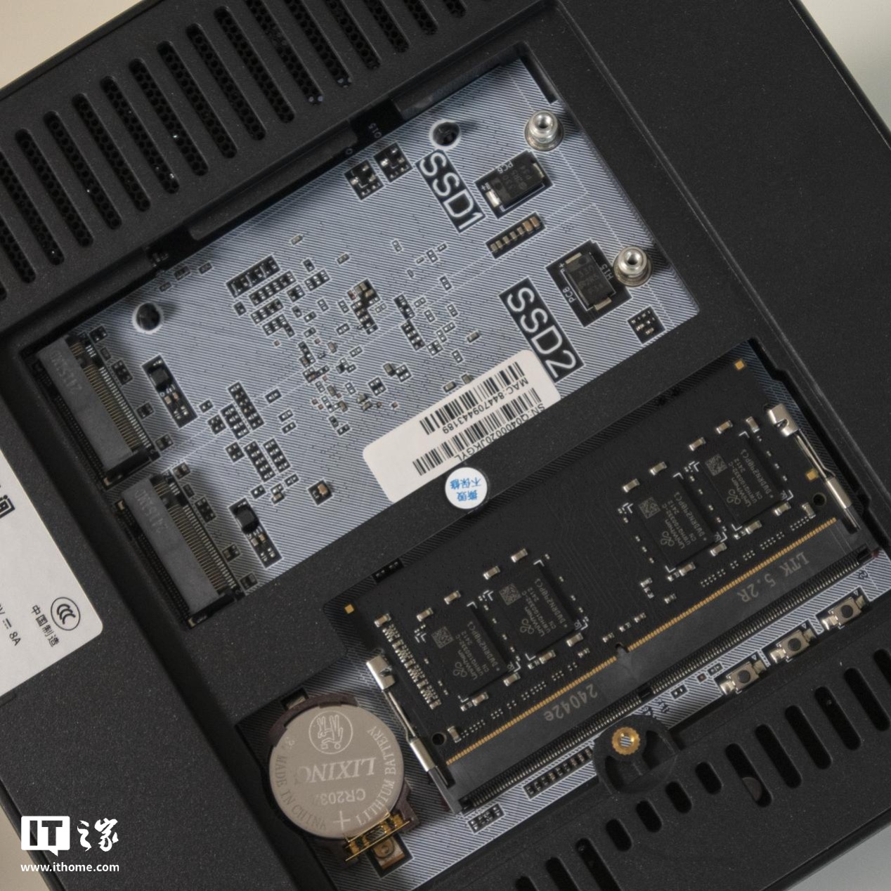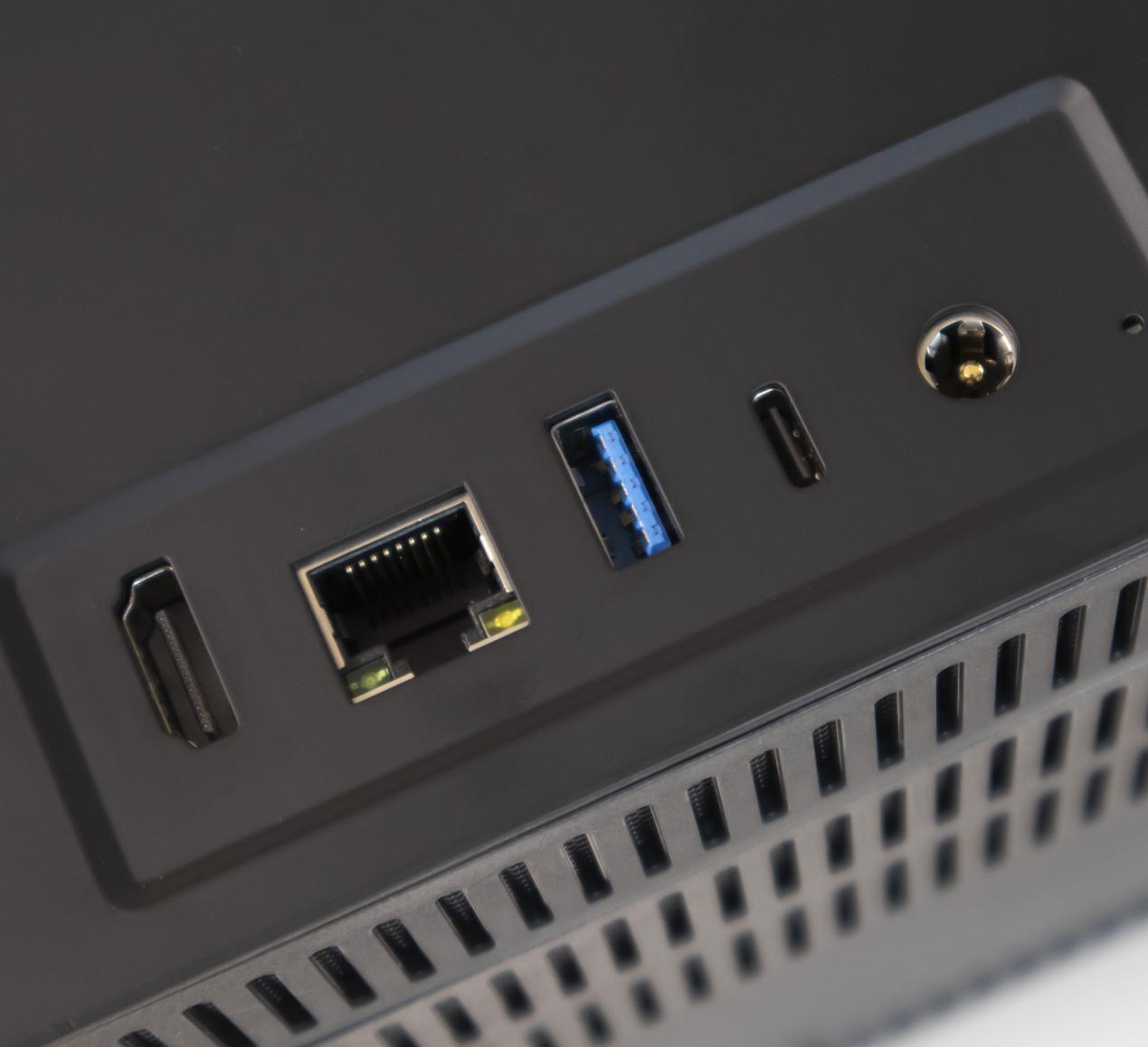 机身背面则为竖向排列的散热格栅,下方还有下沉式的接口集群,这款产品提供了 1 个 HDMI 2.0b 接口,支持 4K@60hz,1 个 2.5GbE 闪速网口,1 个 USB 3.2 Gen2 接口、1 个 USB 3.2 Gen2 Type-C 接口、以及电源接口。