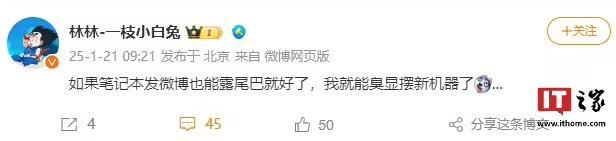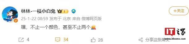 值得注意的是,荣耀中国区副总裁、智慧生活业务部部长 @林林-一枝小白兔 昨天开始也连续发布两条微博,暗示已经拿到荣耀笔记本新品,并透露不止两种配色。两大高管连续爆料,足见荣耀对这款重磅新品的信心。
