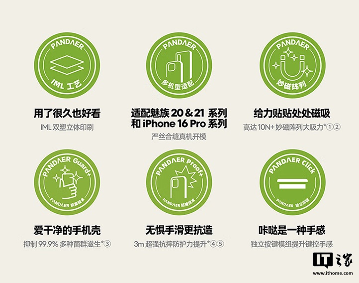 IT之家获悉,系列手机壳号称采用 IML 双塑立体印刷工艺,内置 10N 磁力吸附环体(部分款式手机壳无磁体),同时拥有 PANDAER Proof+ 设计,号称能够在受到碰撞时快速分散撞击力,提升 45% 防摔能力。