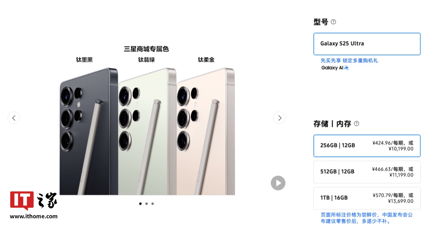 IT之家 1 月 23 日消息,在目前正在进行的三星 Galaxy 全球新品发布会上,三星 Galaxy S25 Ultra 手机正式发布,该机搭载高通骁龙 8 至尊版 For Galaxy 处理器,配备 12/16GB RAM,可选 256GB / 512GB / 1TB 存储空间规格,IT之家整理价格信息如下: