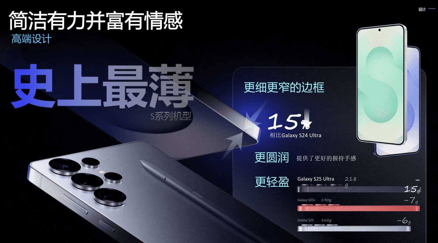 外观设计方面,该机整体尺寸为 77.6×162.8×8.2 毫米,官方称之为“史上最薄的 S 系列机型”,同时机身采用了更细更窄的边框,相比 S24U 窄了 15%,机身重量为 218 克,拥有 IP68 等级防水。