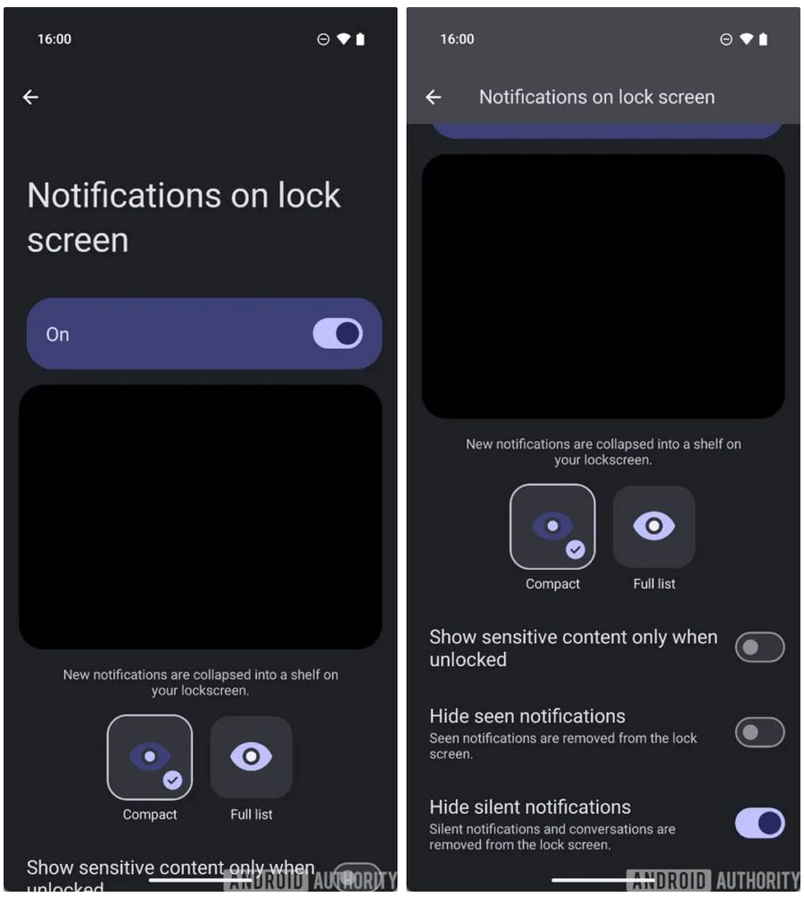 此外安卓新增“隐藏已读通知”和“隐藏静默通知”选项,自动隐藏已查看的通知和静音通知,包括对话消息,进一步减少锁屏界面信息干扰。
