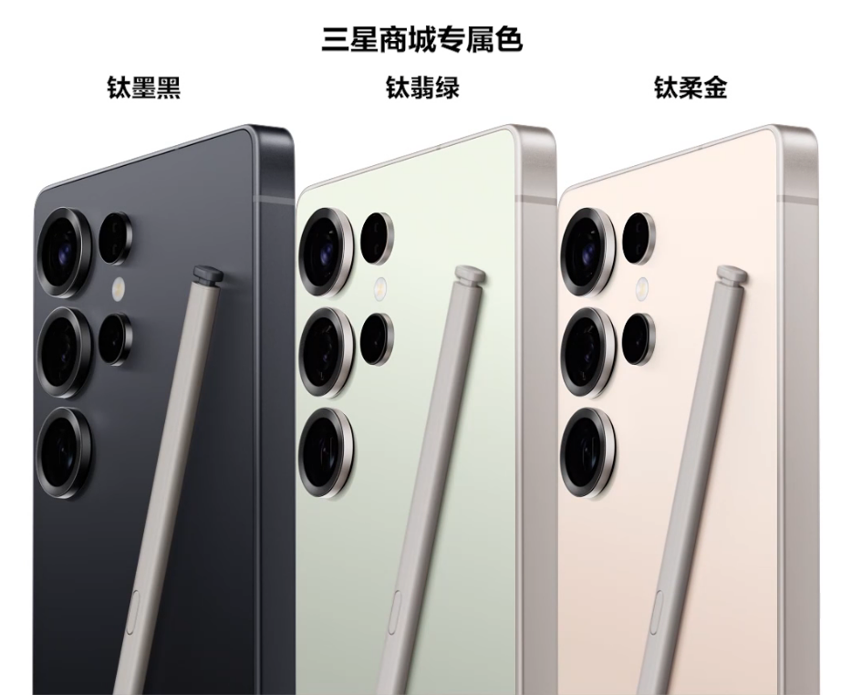 其中 Galaxy S25 Ultra 手机共有钛墨黑、钛翡绿和钛柔金三种颜色,而 Galaxy S25 和 Galaxy S25+ 手机共有幽蓝黑、暖珊红和柔粉金三种颜色。