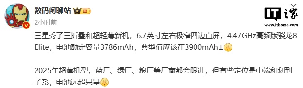 据博主 @数码闲聊站 最新爆料,新机有望搭载 6.7 英寸左右极窄四边直屏,4.47GHz 高频版骁龙 8 Elite 处理器,电池额定容量 3786mAh,典型值应该在 3900mAh±。他还补充道,2025 年超薄机型,vivo、OPPO、小米等厂商都会跟进,但有些定位是中端和划到子系,电池远超苹果、三星。