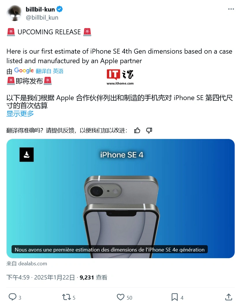 IT之家 1 月 24 日消息,消息源 @billbil-kun 于 1 月 22 日发布博文,曝料称苹果 iPhone SE 4 戴手机壳尺寸为 148.4 x 73.8 x 12.1 毫米,预估手机高度为 144/145 毫米,宽度为 69/70 毫米,机身厚度为 7/8 毫米。