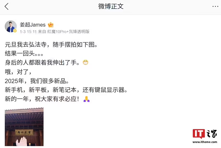 据IT之家此前报道,红魔游戏手机产品总经理 @姜超James 本月(1 月 3 日)发文透露,2025 年红魔将发布手机、平板、笔记本、键鼠显示器等新品。针对是否会推出七寸游戏手机或者八寸高配置游戏平板,他表示“看看我照片上的四个字”(即有求必应)。