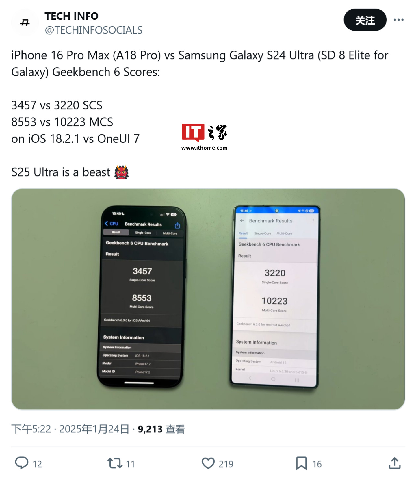 IT之家 1 月 25 日消息,消息源 @TECHINFOSOCIALS 昨日(1 月 24 日)在 X 平台发布推文,曝料对比了三星 Galaxy S25 Ultra(运行 One UI 7.0)和苹果 iPhone 16 Pro Max(运行 iOS 18.2.1)的 GeekBench 跑分。