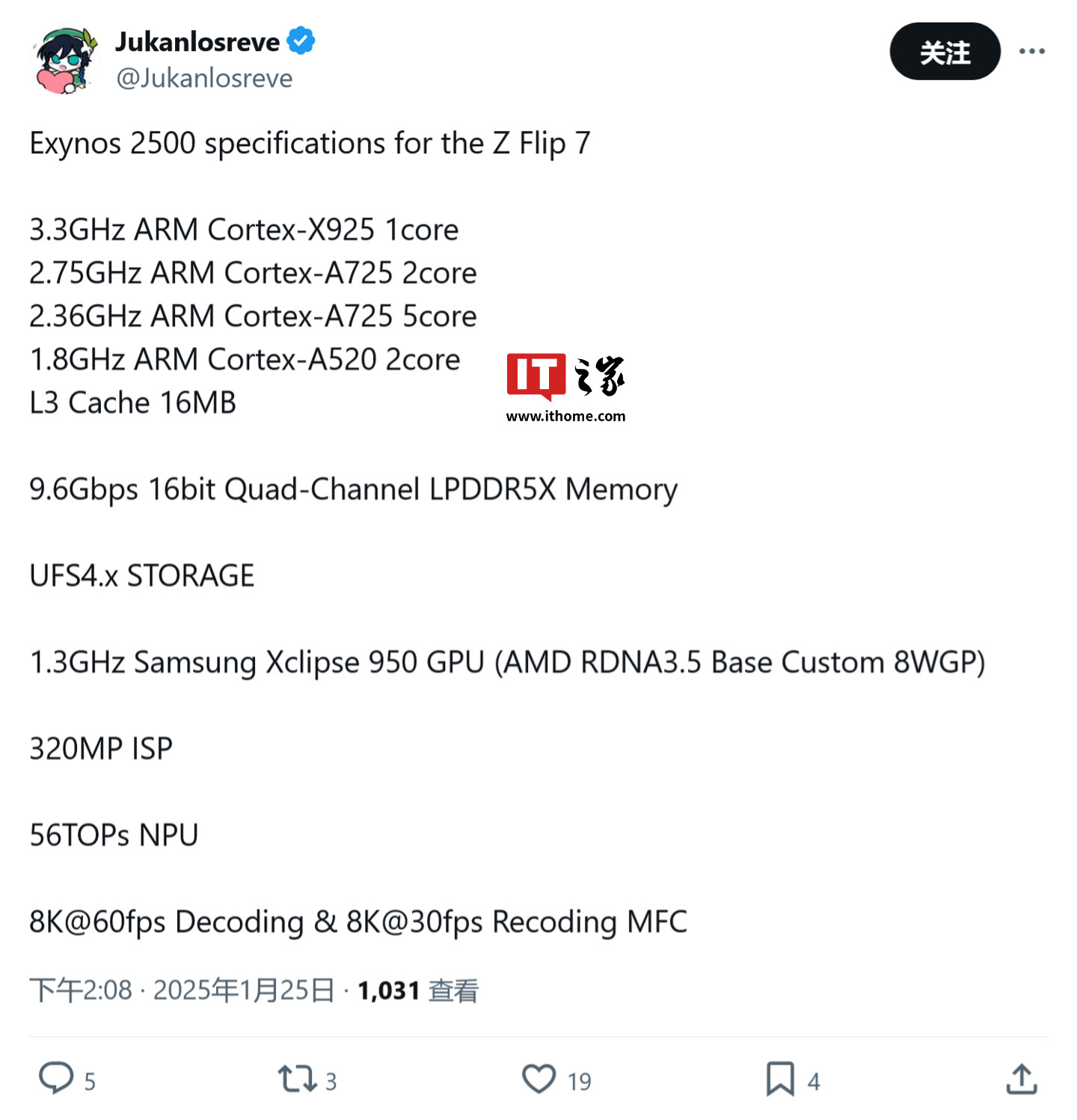 IT之家 1 月 25 日消息,消息源 @Jukanlosreve 今天(1 月 25 日)在 X 平台发布推文,分享了三星 Exynos 2500 的相关信息,并透露该芯片将随 Galaxy Z Flip7 小折叠手机登场