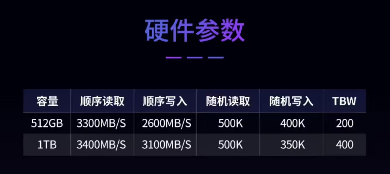 512GB 版本,顺序读取速度可达 3300MB/s,顺序写入速度可达 2600MB/s,随机读取性能可达 500K,随机写入性能可达 350K
