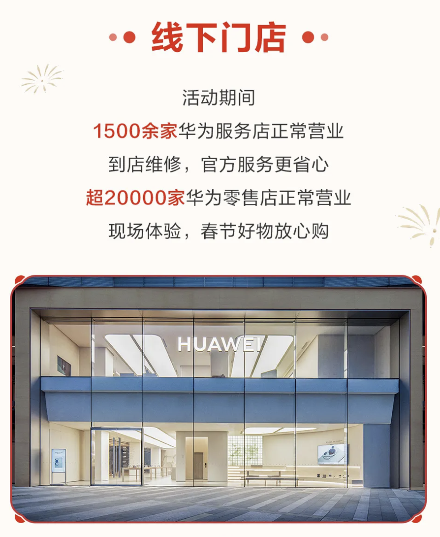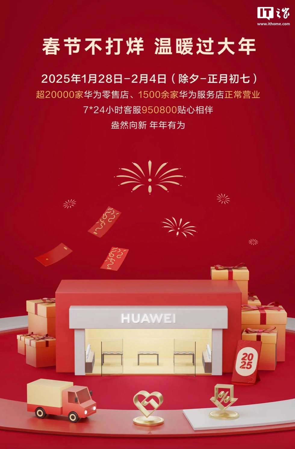 IT之家 1 月 26 日消息,华为终端客户服务发文,宣布春节假期“除夕至正月初七(1 月 28 日至 2 月 4 日)”全国超两万家零售店、一千五百余家华为服务店正常营业。