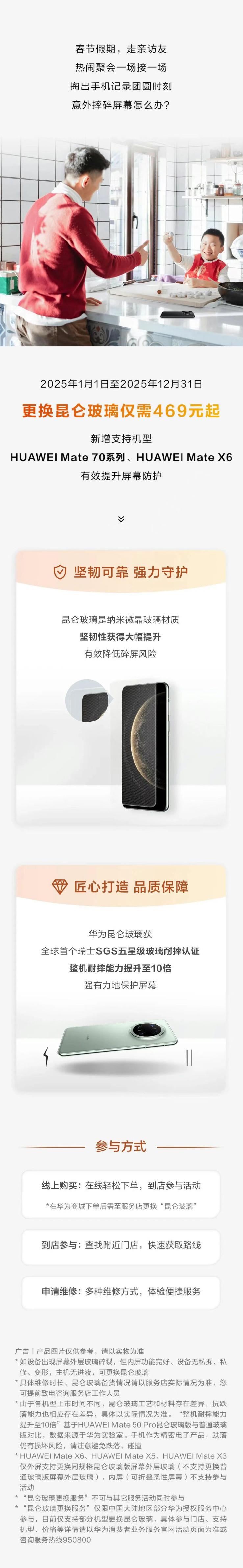 IT之家 1 月 27 日消息,华为终端服务官方今日发文宣布,2025 年 1 月 1 日至 2025 年 12 月 31 日,昆仑玻璃更换服务 469 元起。另外,新增支持华为 Mate 70 系列 / Mate X6 手机更换昆仑玻璃。