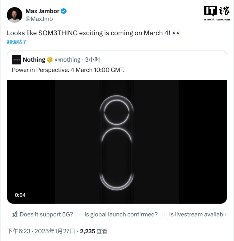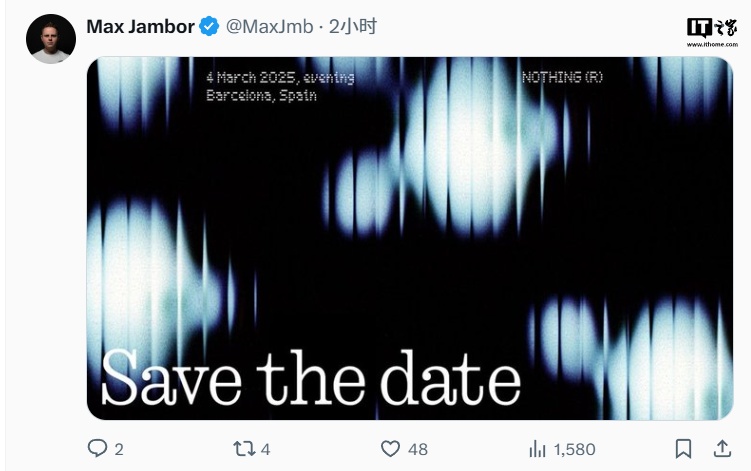 虽然 Nothing 没有直接透露新设备的名称,但爆料人士 Max Jambor 暗示,新品可能是 Nothing Phone 3。在另一条推文中,Jambor 还发布了一份看似官方的邀请函,提到 3 月 4 日在西班牙巴塞罗那举行的活动。这表明 Nothing 很可能会在巴塞罗那举行的世界移动通信大会(MWC)期间发布新手机,该大会将于当地时间 3 月 3 日开幕。