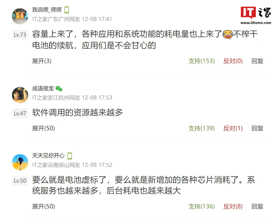 有IT之家家友就曾指出:容量上来了,各种应用和系统功能的耗电量也上来了。