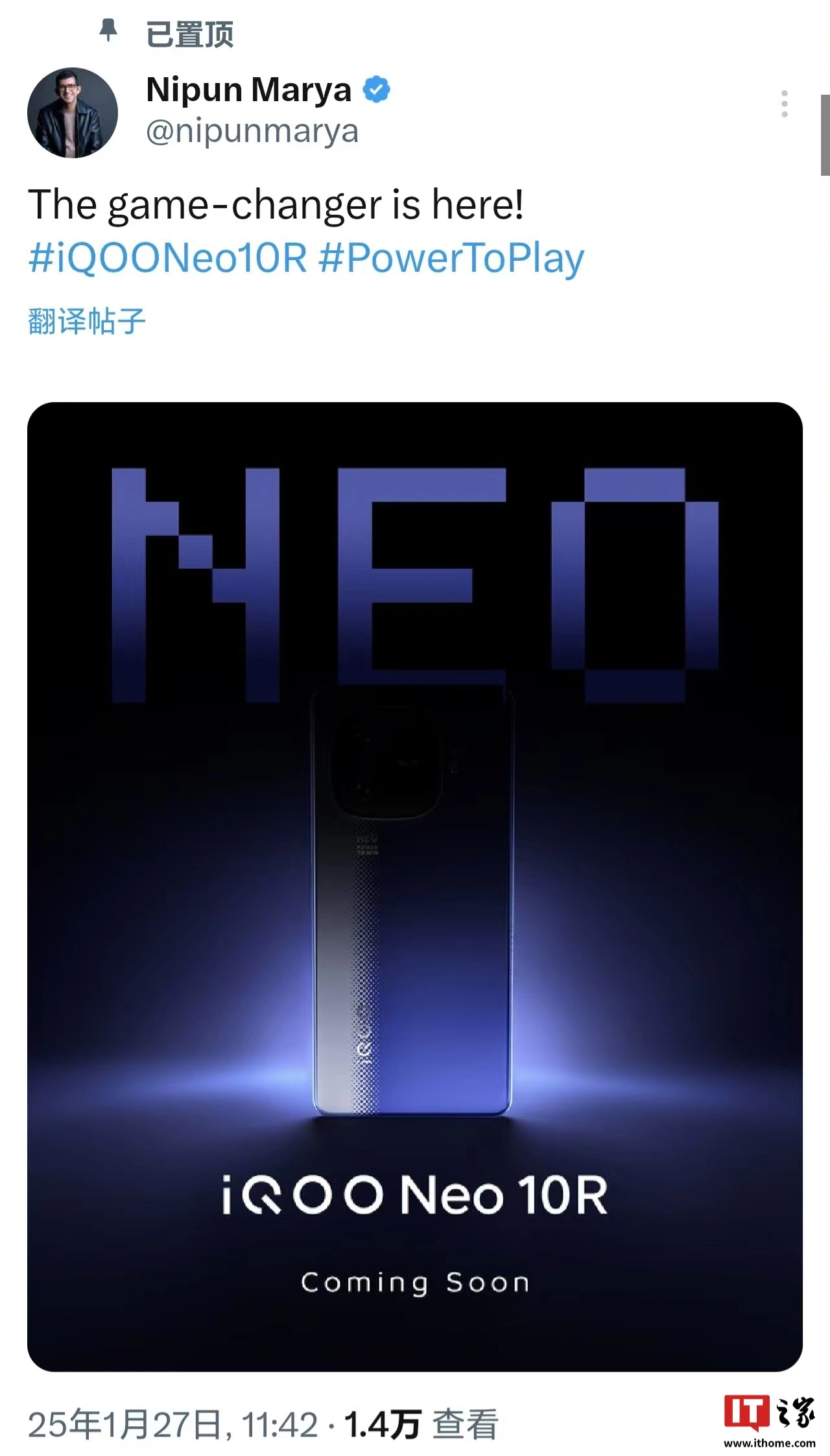 IT之家 1 月 28 日消息,iQOO India 首席执行官 Nipun Marya 昨日发文确认,iQOO Neo 10R 手机即将发布(未透露具体时间,宣传海报仅显示 Coming Soon)。