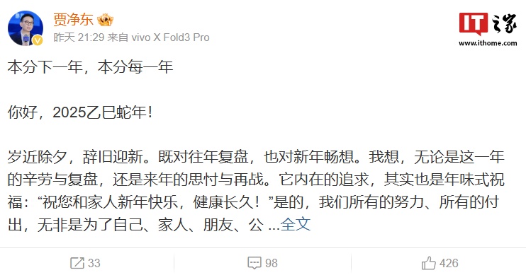 IT之家 1 月 28 日消息,vivo 品牌副总裁,兼品牌与产品战略总经理贾净东昨日发文介绍了 vivo 2025 的新年畅想,他直言 vivo 不会采用激进的市场进入策略,或者追求全球份额增长为唯一目标。