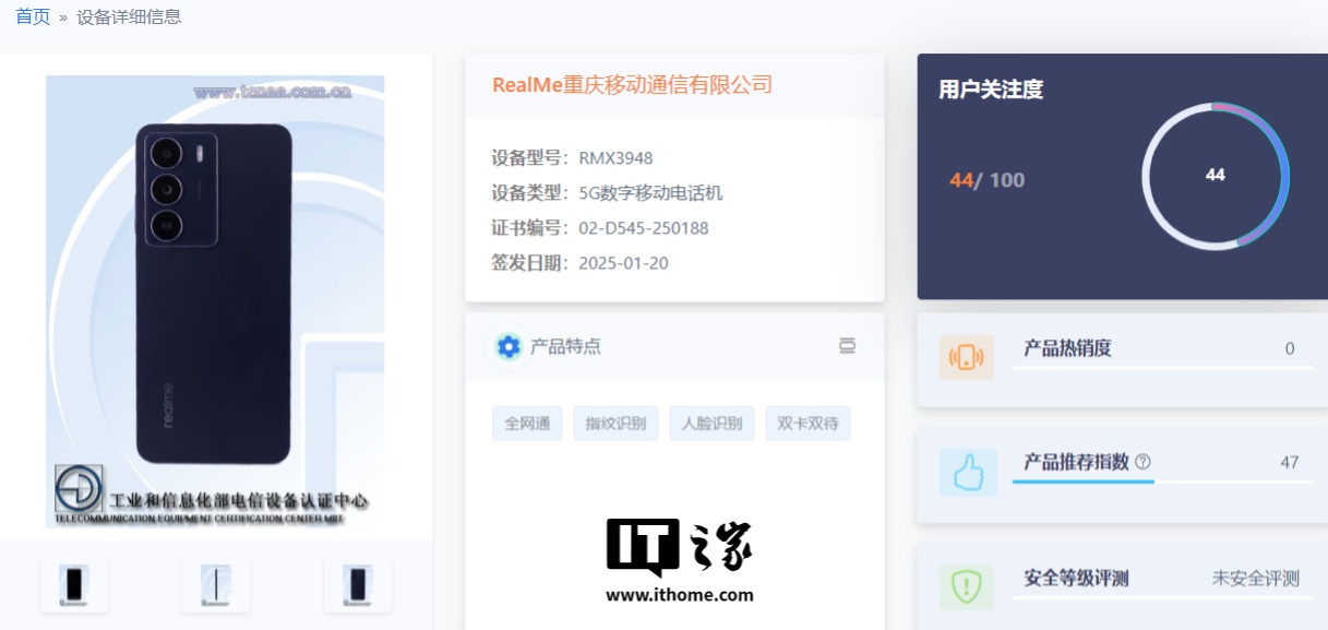 文章来源于互联网:IT之家-真我 RMX3948 / RMX3946 新机现身电信设备终端网:4880mAh 电池、屏幕分辨率 720×1604