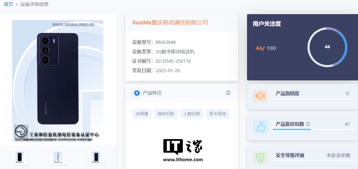 IT之家 1 月 28 日消息,型号为 RMX3948 / RMX3946 的两款真我新机已现身电信设备终端网,两款机型参数一致,外观与海外版 realme 14x 相似。