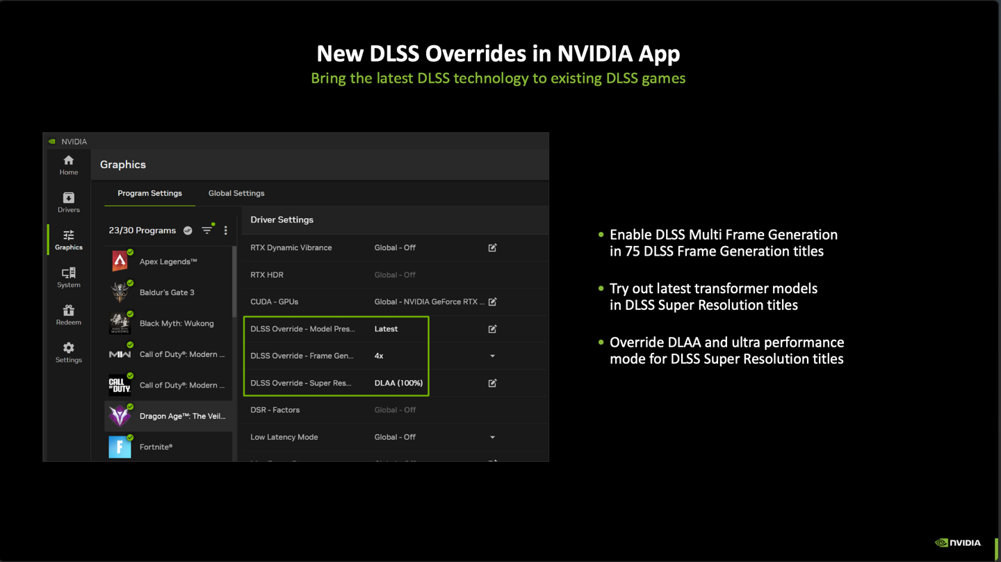 针对目前 DLSS 4 适配游戏较少的问题,英伟达推出了 DLSS Override 功能进行缓解,这个功能能让支持 DLSS 且还没有适配 DLSS 4 的游戏获得 DLSS 4 的帧生成和超分体验。