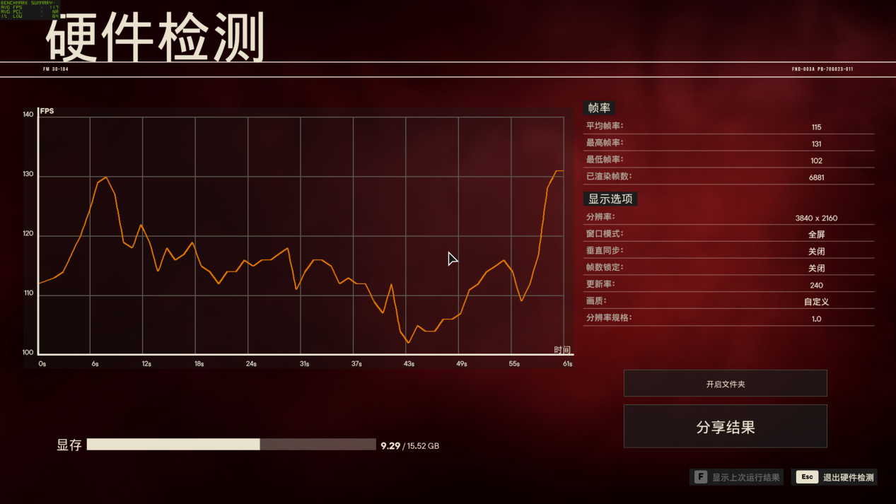 在 4K 分辨率 + 极高画质下,游戏平均帧数为 131 帧,1% Low 帧 117 帧;