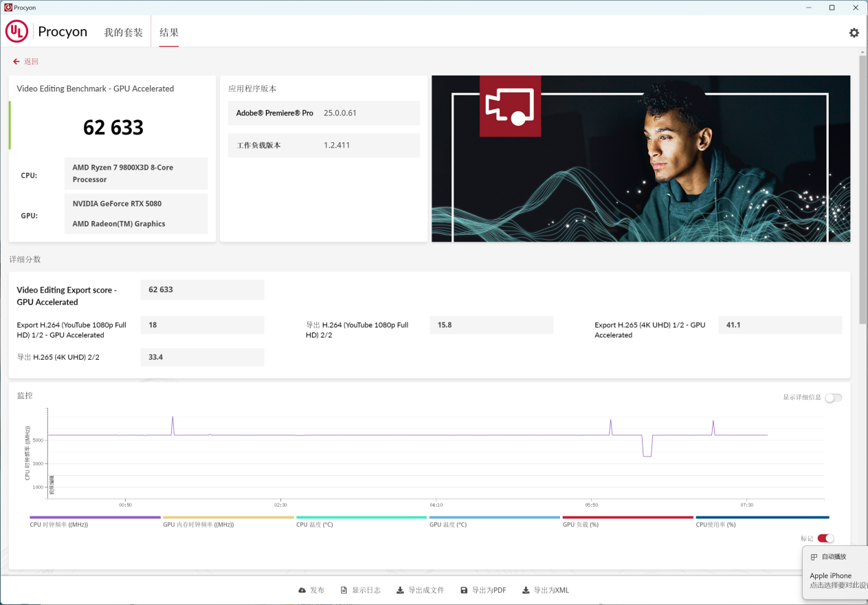 在视频剪辑性能测试中我们开启了 GPU 加速,得益于 RTX 5080 Blackwell 架构的第九代 NVENC,其在 H.264 / H.265 4:2:2 编码的 8 位和 10 位视频上有着非常大的优势,最终获得了 62633 分。