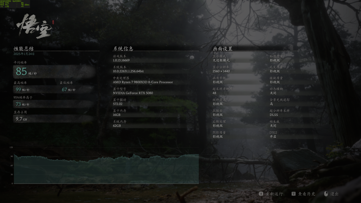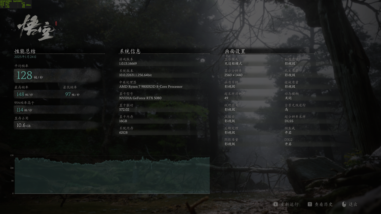 可以看到在 RTX 5080 的加持下,4K 分辨率 + 影视级画质的黑猴也能达到 120 帧以上的游戏平均帧数,体验提升巨大。