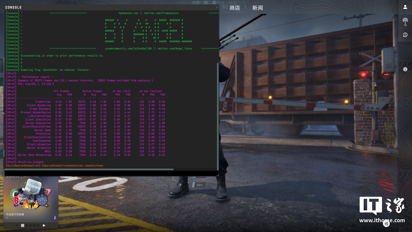 首先是《CS2》,这款游戏相较于《CS:GO》性能压力大了不少,不过即便如此 NVIDIA GeForce RTX 5080 FE 依旧在 4K 分辨率 + 高画质下跑出了 291 分的游戏平均帧数,1% Low 帧也有 126.3 帧。