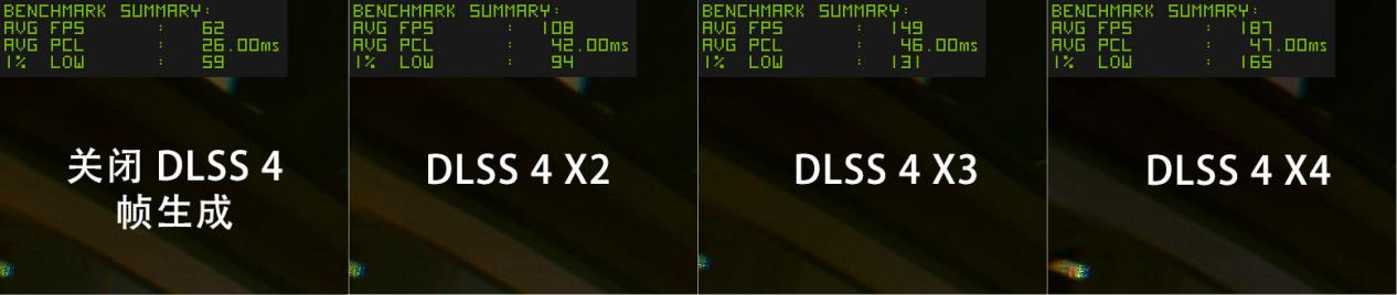 我们依次在 4K 分辨率 + 超级光追画质 + DLSS 性能设置下,选择 2x、3x 和 4x 多帧生成,运行游戏基准测试,分别得到了 144.96 帧、201.31 帧和 248.25 帧的游戏平均帧数,2x 和 3x 多帧生成的表现,非常接近 71.25 帧的 2 倍和 3 倍帧数,在 4K 分辨率的条件下,通过 4x 多帧生成技术所达成的 248.25 帧的体验。这一帧率水平远超预期,画面流畅度极高。