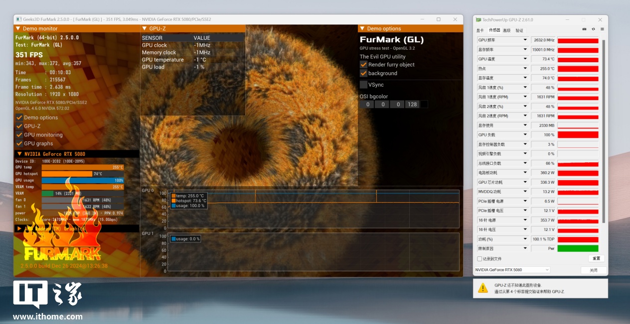 作为一款高端显卡,GeForce RTX 5080 有着怎么的性能与性能释放呢?接下来就进入理论测试环节。先看烤机,单烤甜甜圈 10 分钟,GPU 的核心温度稳定在 73.4℃左右,显卡频率 1500MHz,芯片功耗稳定在 336W 左右,而电路板功耗则是和官方宣传的一致,为 360W。搭配 i7 / i9 或锐龙 7、锐龙 9 这样的高端处理器,1000W 的电源足以。
