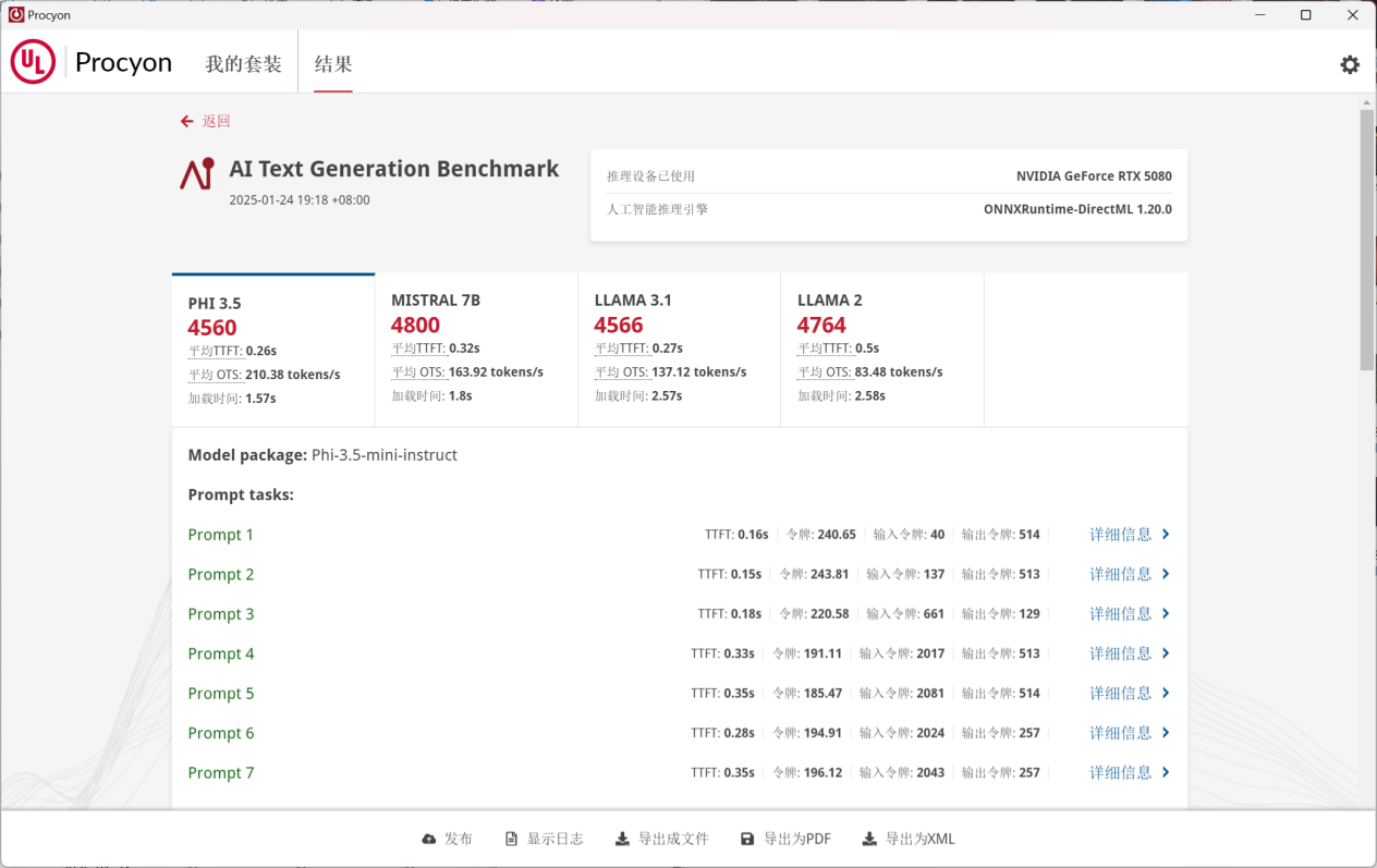 最后是考验 AI 性能的大语言模型测试,面对 7B 参数量的 LLAMA 2 模型平均 OTS 也有着 83.48tokens / s,十分出色。