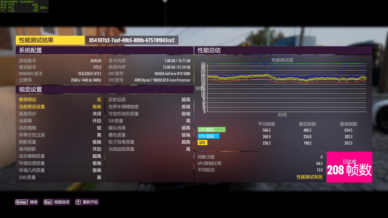 在 2K 分辨率 + 极端画质下,游戏平均帧数为 208 帧,1% Low 帧 158 帧;