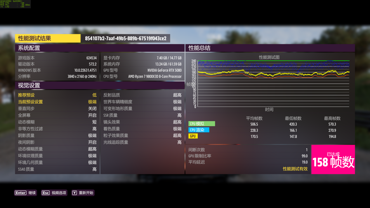 在 4K 分辨率 + 极端画质下,游戏平均帧数为 158 帧,1% Low 帧 125 帧;