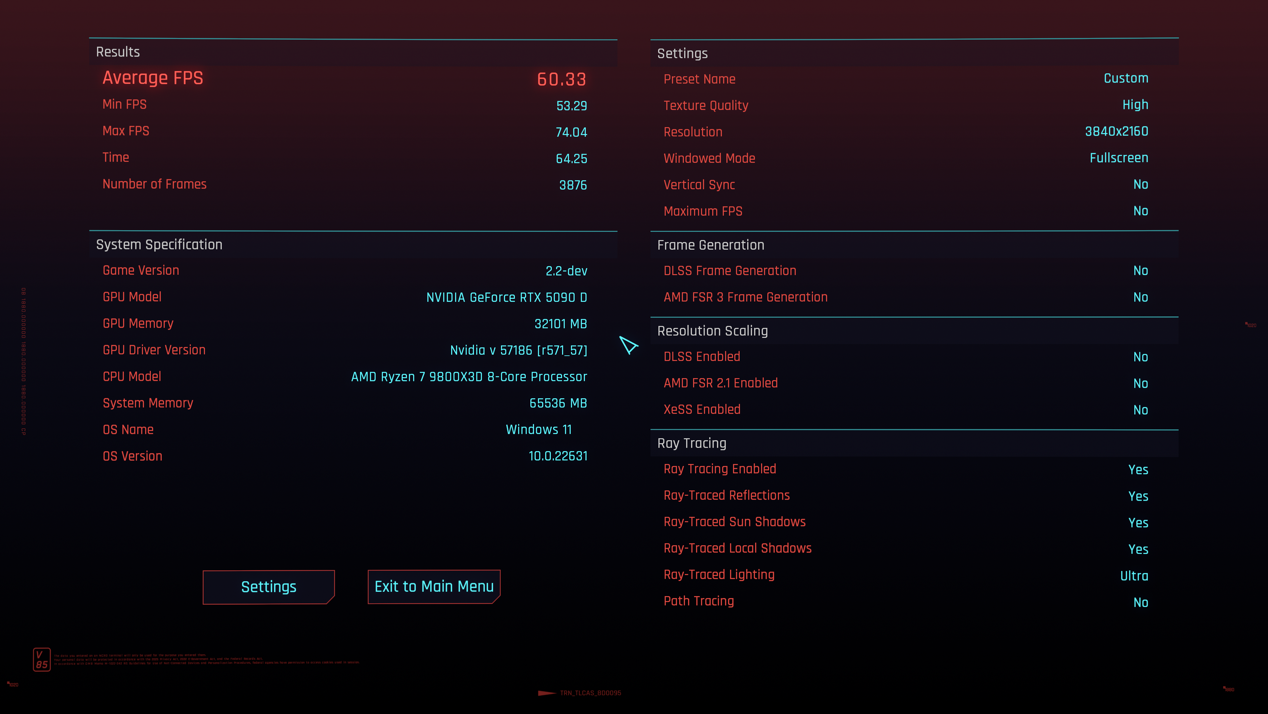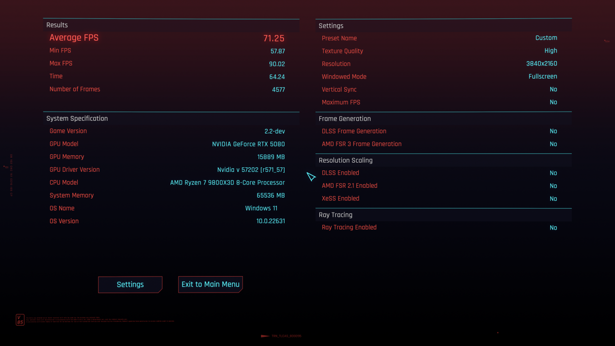 《赛博朋克:2077》目前的 steam 测试版已支持 DLSS 4,我们通过它来了解下 DLSS 4 的实际体验。如果是 4K 分辨率 + 超级画质,不开光追和 DLSS,游戏平均帧数的表现还可以,能达到 71.25 帧。