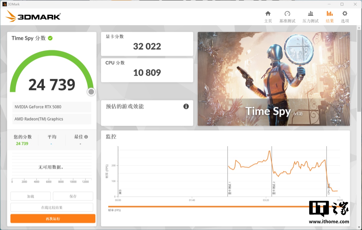 在 3DMark Time Spy DX12 测试中,NVIDIA GeForce RTX 5080 FE 分数达到了 32022 分,作为对比 GeForce RTX 4080 FE 的分数为 26552 分,提升约为 21%,提升幅度较大。