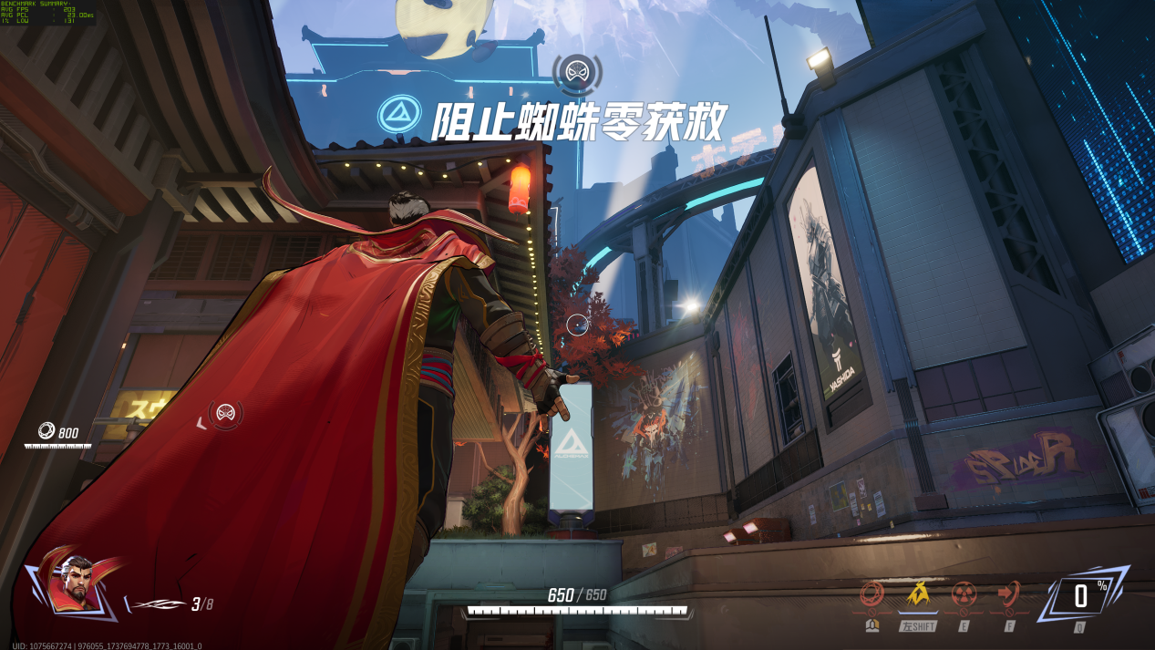 我们以《漫威争锋》为例,在 4K 分辨率 + 高画质 + 关闭 DLSS 情况下,游戏平均帧数 147 帧,1% Low 帧 97 帧,游戏平均延迟 15ms;