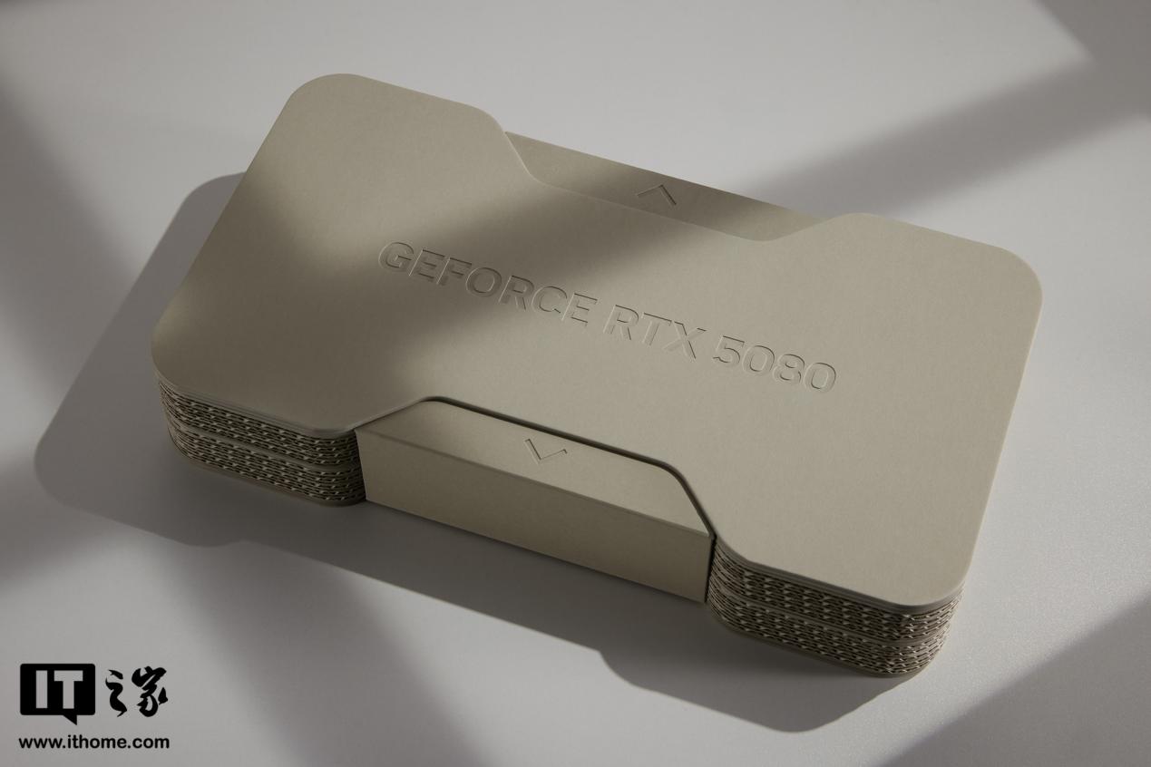 NVIDIA GeForce RTX 5080 的包装相比上一代更加环保,没有复杂印刷装饰,仅是原色纸箱。纸箱中间印有硕大的产品型号 GEFORCE RTX 5080,抽出上下两片固定卡片即可打开包装。