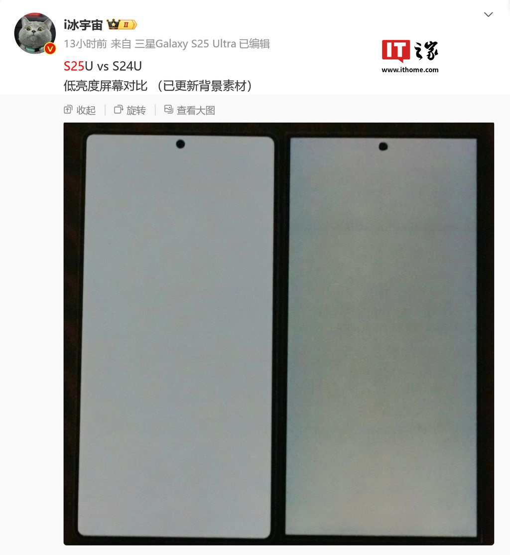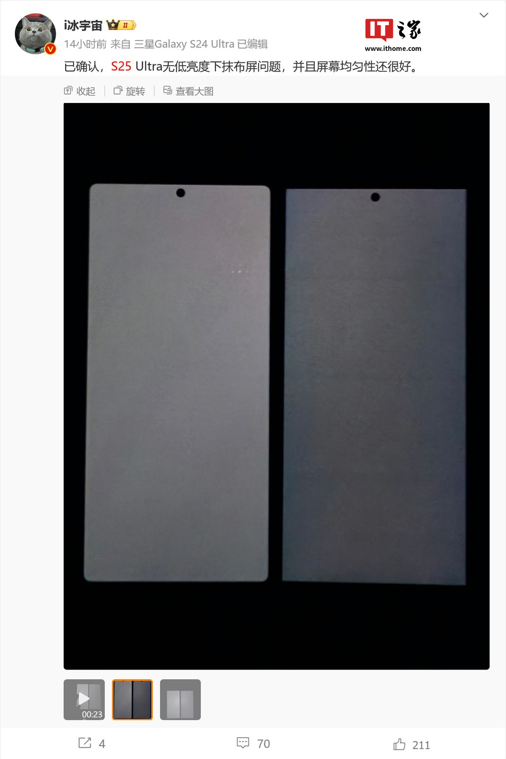 IT之家 1 月 30 日消息,消息源 @i冰宇宙 昨日(1 月 29 日)发布微博,表示三星 Galaxy S25 Ultra 在低亮度下,已解决抹布屏问题,大幅减少颗粒感,而且屏幕均匀性还很好。
