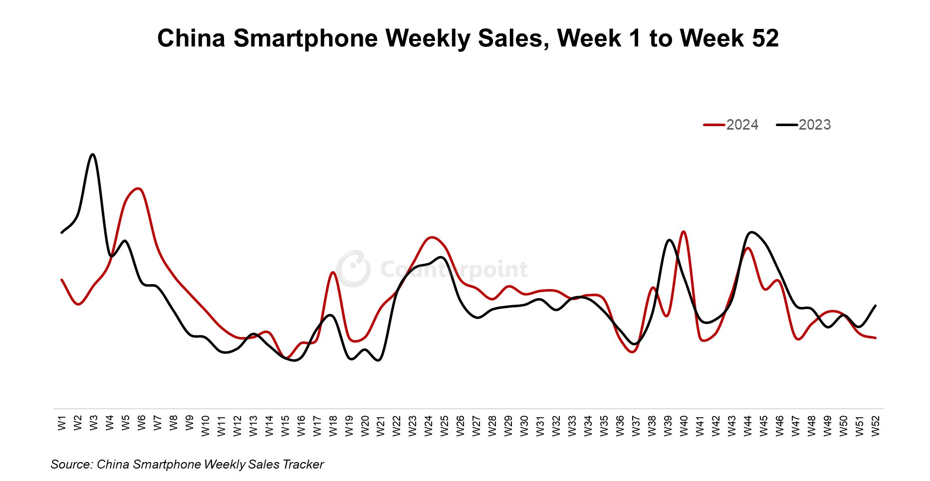 根据 Counterpoint 的中国智能手机周度销量追踪数据,2024 年中国智能手机销量同比增长 1.5%。但市场表现并不均衡,年初和年末都相对疲软,不及上年同期;不过,从第 5 周到第 36 周,销量普遍好于去年同期。IT之家附上图片如下:
