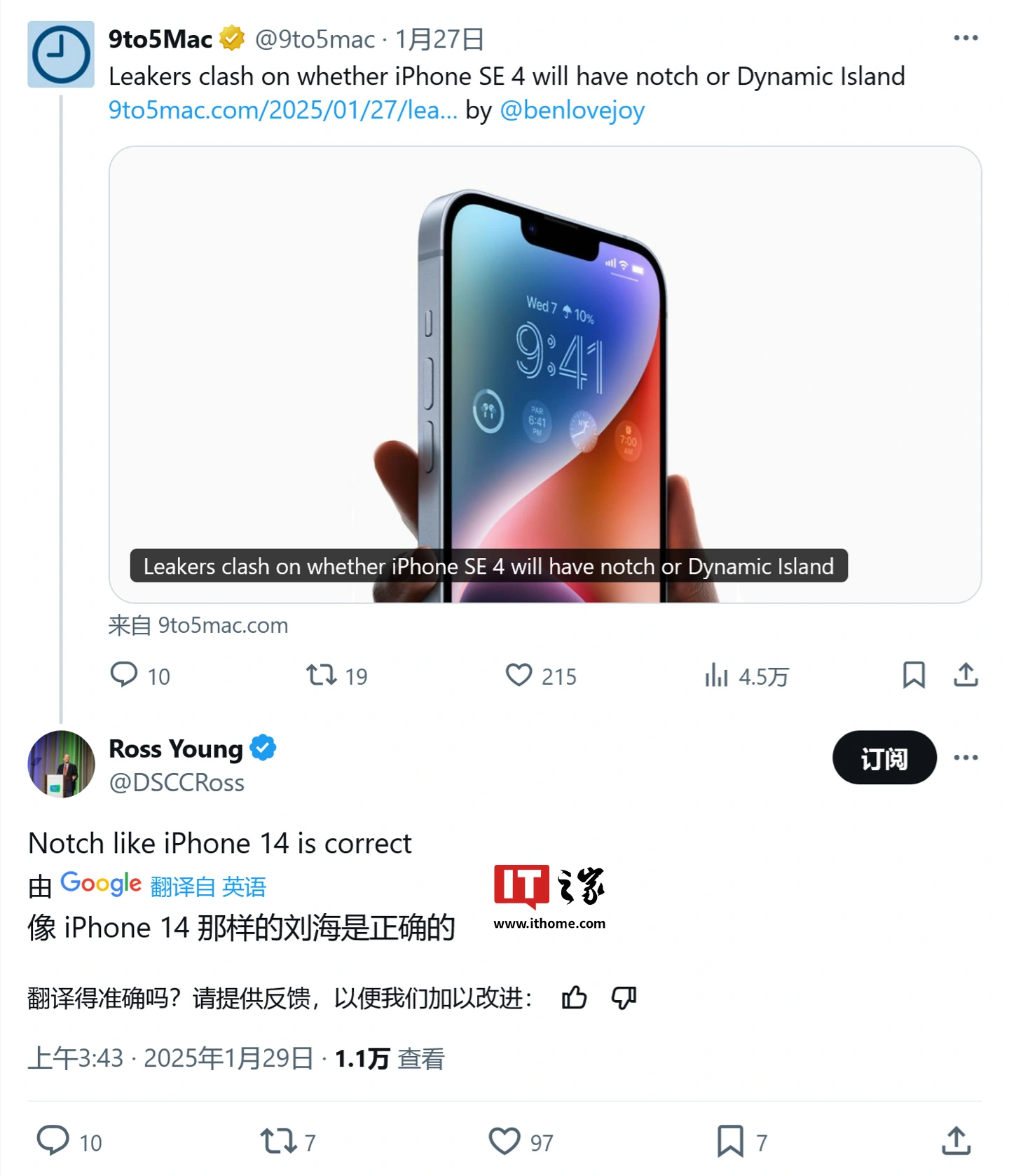 IT之家 1 月 30 日消息,屏幕供应链咨询公司 DSCC 首席执行官罗斯・杨(Ross Young)昨日(1 月 29 日)在 X 平台发布推文,认为苹果即将推出的 iPhone SE 4 并非配备灵动岛,而是配备和 iPhone 14 同款刘海屏幕。