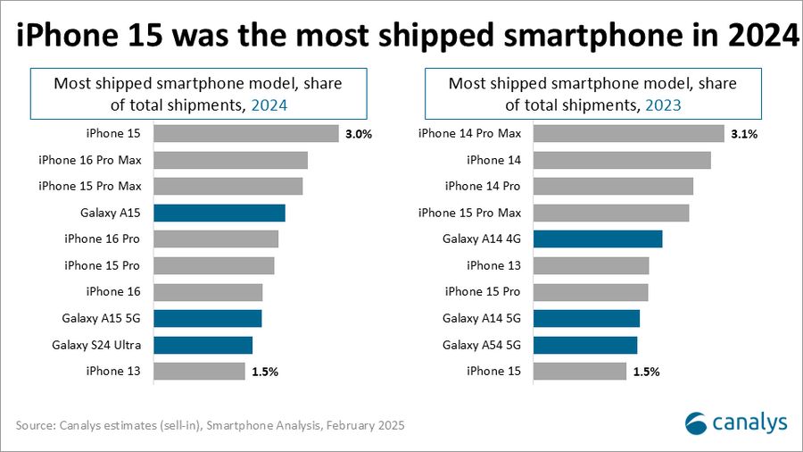 2024 年最畅销的安卓手机是 Galaxy A15,位列第四,排在苹果 iPhone 15、iPhone 16 Pro Max 和 iPhone 15 Pro Max 之后。第五、第六和第七名分别被 iPhone 16 Pro、iPhone 15 Pro 和 iPhone 16 占据,随后是排名第八的三星 Galaxy A15 5G、第九的 S24 Ultra 和第十的 iPhone 13。